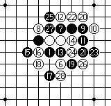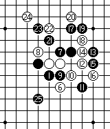 白14占K8黑禁手点强防。黑15跳三,黑17组山形扩展,黑优势。 |