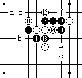 白10防于I11点。黑11多着于a点,也有着于b、c、d点。 |