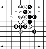 白16于I11点最强防守。黑17有a、b、c、d、e等招法。 |