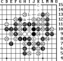 1991年日本东京国际公开赛,黑:砂川M.,白:河村典彦,黑25于J12点斜跳三,败招,白48黑投了。