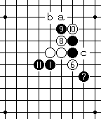 白8于I10点成角。黑9有a、b、c三种着法。 |