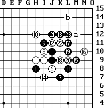 黑11着于G9点,白12挡斜二。黑13有a、b、c、d等着法,e、f、g、h、i、j、k、l、m点较弱。 |