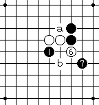 黑7阻挡对方的斜二;白8多防于a点,b点弱。 |