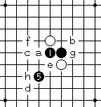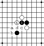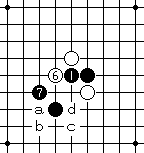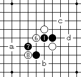 白6于G8点斜成二挡横二。黑7有a、b两种着法,c、d点错招。 |
