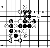 白8于F5点挡斜跳二,黑9眠三。黑11双跳二做棋,胜势。白12斜活三,白14盖冲。黑15活三,黑17、19斜活三,黑21跳三,黑23做追杀,黑25冲四,黑27斜活三,以下黑有依次a、b、c追四,胜定。 |