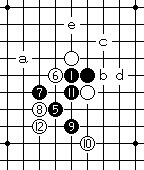 黑9、11斜活三,黑13有a、b、c、d、e等着法。 |