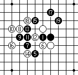 1988年8月修善寺第26期全日本连珠名人战A级联赛第五轮,黑:古坂学俊,白:西山厚,云月局,黑11于H5点做棋,至17软招,