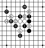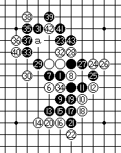 1984年7月日本富士第3回东西团体对抗战,黑:西军京都早川光胜八段,白:东军富士米泽治一六段,白10于G8点分断黑跳二,同时成眠三并斜二,黑33活三,白投了。 |