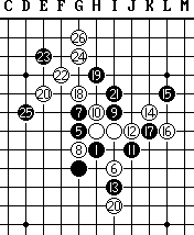 白12于K8点强防。黑13于I6点盖眠二。黑15跳二,棋势平衡。 |