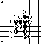 白12防于I11点。黑13有a、b、c三种着法,也有着于d点。 |