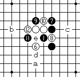 白12于J9点眠三。黑13有a、b、c三种着法,d、e点较弱。 |