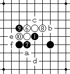 黑9着于I6点。黑11多着于a点,b、c点也很强,d、e、f点少而弱。  |