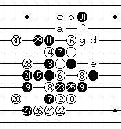 黑9着于I6点。黑11多着于a点,b、c点也很强,d、e、f点少而弱。 |