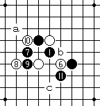 白10挡二。黑11斜活二。白12有a、b、c等多种防守,黑必胜形。 |
