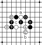 黑9着于I0点。黑11挡斜二。白12有abc等防守,de点弱。 |