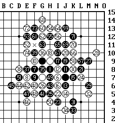 1983年日本关东第23期彗星战,黑:Nisisu,白:Usio,新月局,黑9于I11点斜活三,白12斜活三,方向错误,败招,黑31白投了。 |
