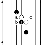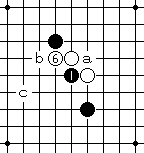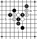 白12着于G5点。黑13有a、b两种着法,c点弱。 |