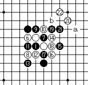 黑9着于H10点。白10挡二并成斜二。白12组折形双二。黑13挡斜二。白14再挡斜二。黑15跳眠三并斜跳二。白16断冲并斜活二。以下黑有a或b两种着法,黑棋优势。 |