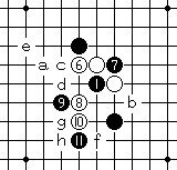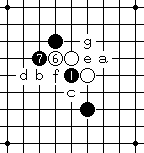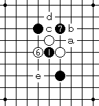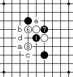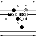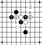 黑7着于I9点。白8挡斜二。黑9有a、b、c、d等着点,其余点弱。 |