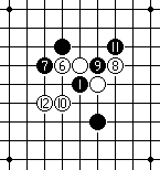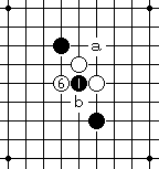 黑7于F9点斜二并挡二。白8多着于a点,其他点少而弱。 |