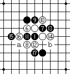 黑11于H7点斜跳三,白12阻断,形成反做杀。黑13有a点抢攻和b点强防两种着法。 |