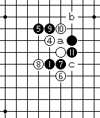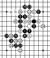 黑9于K8打,1980年代的追胜定式。白10防于a点最强,实战也有b、c、d等点。 |