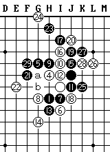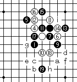 黑11于I7点做棋,1980年代多着于此,以为黑有利。白12有a、b两种强招,其中a点白棋必胜,防于c、d、e点较弱。 |