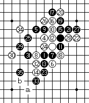白14于G7点活三,白16跳冲四,白18挡斜二。黑19跳二做棋。败招,黑21组特型眠三并斜二。黑23斜活三,黑25做杀,黑27组山形双二。黑29做棋。白30斜跳三,白32跳四,黑33反斜活三,黑35盖冲,棋势平衡。以下白棋可从a或b点攻防。 |
