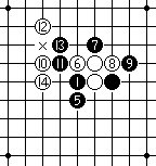 1985年第38回全日本连珠通信战,黑:K???,白:M???,寒星局,黑9先于H11点跳冲四,黑11再I10点组山形并挡二,同样黑棋胜势,黑31跳冲四活三,白投了。