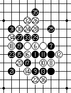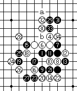 黑15于G8点冲四,黑17斜活三,白18防守反向,败招,黑19、21冲四,黑23、25斜活三,黑27活三,白28跳冲四,白30再防。黑31冲四,黑33斜活三,以下黑有a、b追四,胜定。本谱选自1983年第21期全日本连珠名人战九州预选赛,黑:小塚和人,白:Fudzhinami H.,流星局,黑33白投了。 |