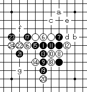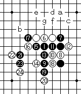 黑21于E7点挡斜二。白22防。黑23有多种变化,其中a、b、c等点为强防,也有防于d、e、f点,g点弱。 |