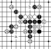 黑17于K10点斜活三拓展,白18必然反做杀,白20盖冲。黑21斜二挡二。白22斜活三,白24有a、b等多种变化,棋势平衡。