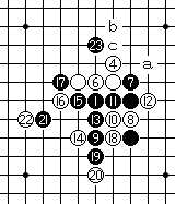 白18于G8点盖冲。黑19组双二。白20亦组双二。以下黑棋有a、b、c等多种着法,白棋优势。 |