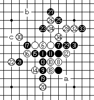 | 黑15斜冲四,黑17活三,白18防守。黑19做杀,白20斜活三防守,黑21反做杀,白22先斜冲四,白24再防守。黑25跳四,黑27斜活三,白28防守。黑29跳三,白30阻断。黑31做杀,以下黑有a或b、c胜。 |