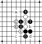 | | 白10防于L8点。黑11有a、b、c三种防守,d、e点弱。 |