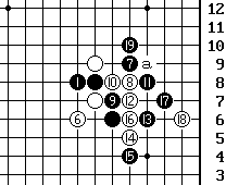 | | 黑13反向防守于L6点也强。白14跳眠三。黑15盖冲。白16分断黑跳二。黑17斜活三,黑19斜跳二,黑棋胜势。以下白棋防点很多,其中以a点最强。