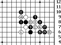 黑11着于L8点。白12分断黑斜跳二,同时斜活三,白14防于禁手点。黑15盖冲。白16断跳二。黑17斜活三,白18防外端。黑19做杀。