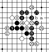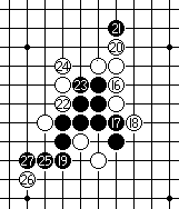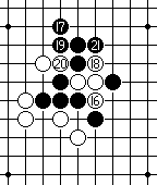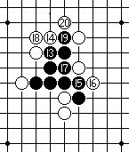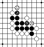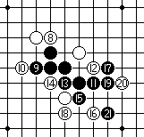 白20如果守于外围的M7点或内侧H7点,黑棋便可径走H4点做杀后,黑棋有连攻胜。