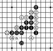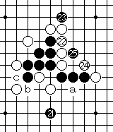 白8防守在F7点。黑9活三;白10如果挡在左端,则与白8挡在c点的棋形相同。黑13活三,白14拦在下端,黑15冲四,黑17再活三;白18挡在左侧。黑19跳冲四;黑21跳活三;白22防守。黑23一子双杀。此时,黑棋同时有a、b两个胜点,白棋无法防守,黑胜。