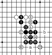 黑7于K7点成二;白8正招防于a点,b点败。 |