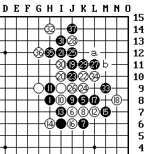 黑21于I5点组角。黑23跳三,要点,以下黑胜,白24阻断,反斜活三。黑25反斜跳冲四,黑27、29继续跳冲四,黑31斜活三,黑33斜冲四,黑35斜活三。西村敏雄九段发现。 |