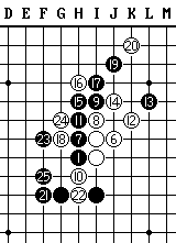 1984年日本中村茂挑战赛,黑:中村茂,白:中村K.,新月局,黑23于F7点做杀,也胜势,黑31活三,白投了。
