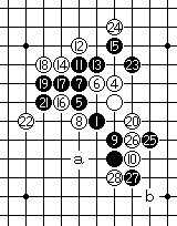 白8防守于G9点,正确。黑9应着于a点,也有着于b点。 |
