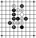 黑7于G10点活二挡二,白8挡斜二,弱防。黑9活三,白10反斜活三,黑11反跳三,白12反冲四,白14组角。黑15跳冲四,白16反活三,黑17挡,并成山形双二,黑优势。
