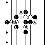 黑11正招于F9做棋,抢占了白的一个要点。白12有a、b两种强防守。 |