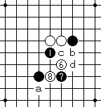 黑7斜成二,同时阻白一个斜二,唯一强招。白8有a、b两种着法。 |